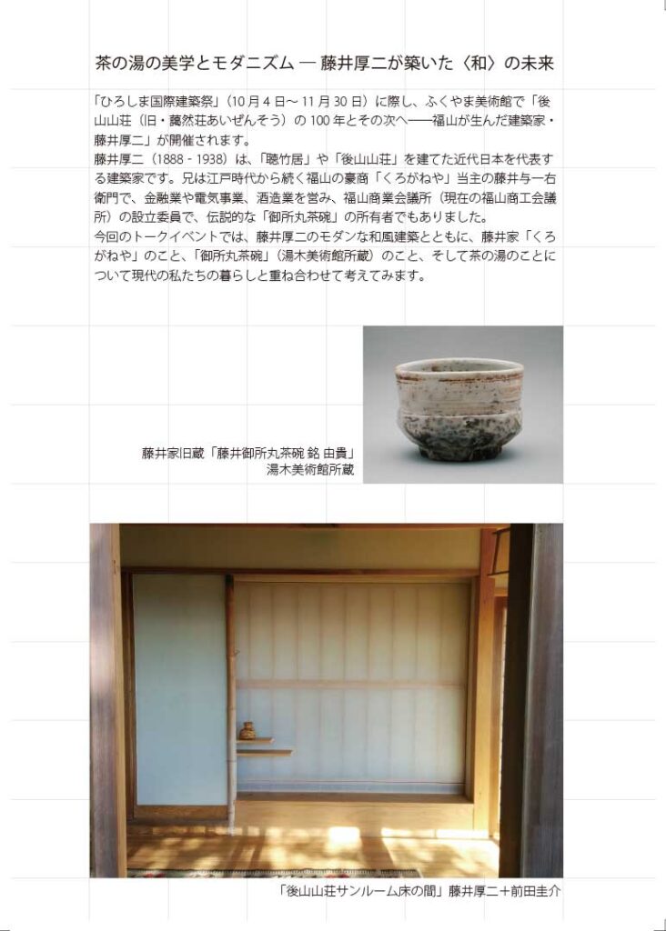 ふくやま美術館では 「後⼭⼭荘(旧・藹然荘あいぜんそう)の100年とその次へ―福山が生んだ建築家・藤井厚二」が開催されます。